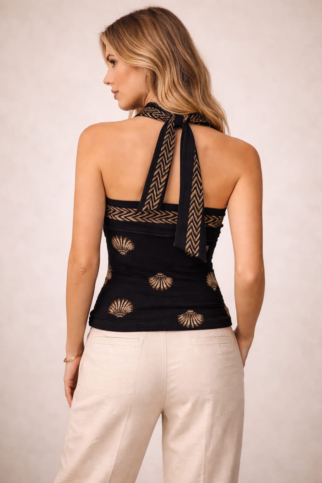 A Blusa Frente Única Conchita é a escolha perfeita para um visual sofisticado com toque tropical. Com estampa de conchas em contraste elegante, a peça traz uma proposta moderna e cheia de personalidade. Seu design frente única com alças cruzadas no colo valoriza o busto e os ombros, criando um visual feminino e marcante. O caimento ajustado ao corpo destaca a silhueta, enquanto o tecido leve garante conforto ao longo do dia. Versátil, pode ser combinada com peças de alfaiataria para um look mais refinado ou com jeans e saias para produções casuais e estilosas.