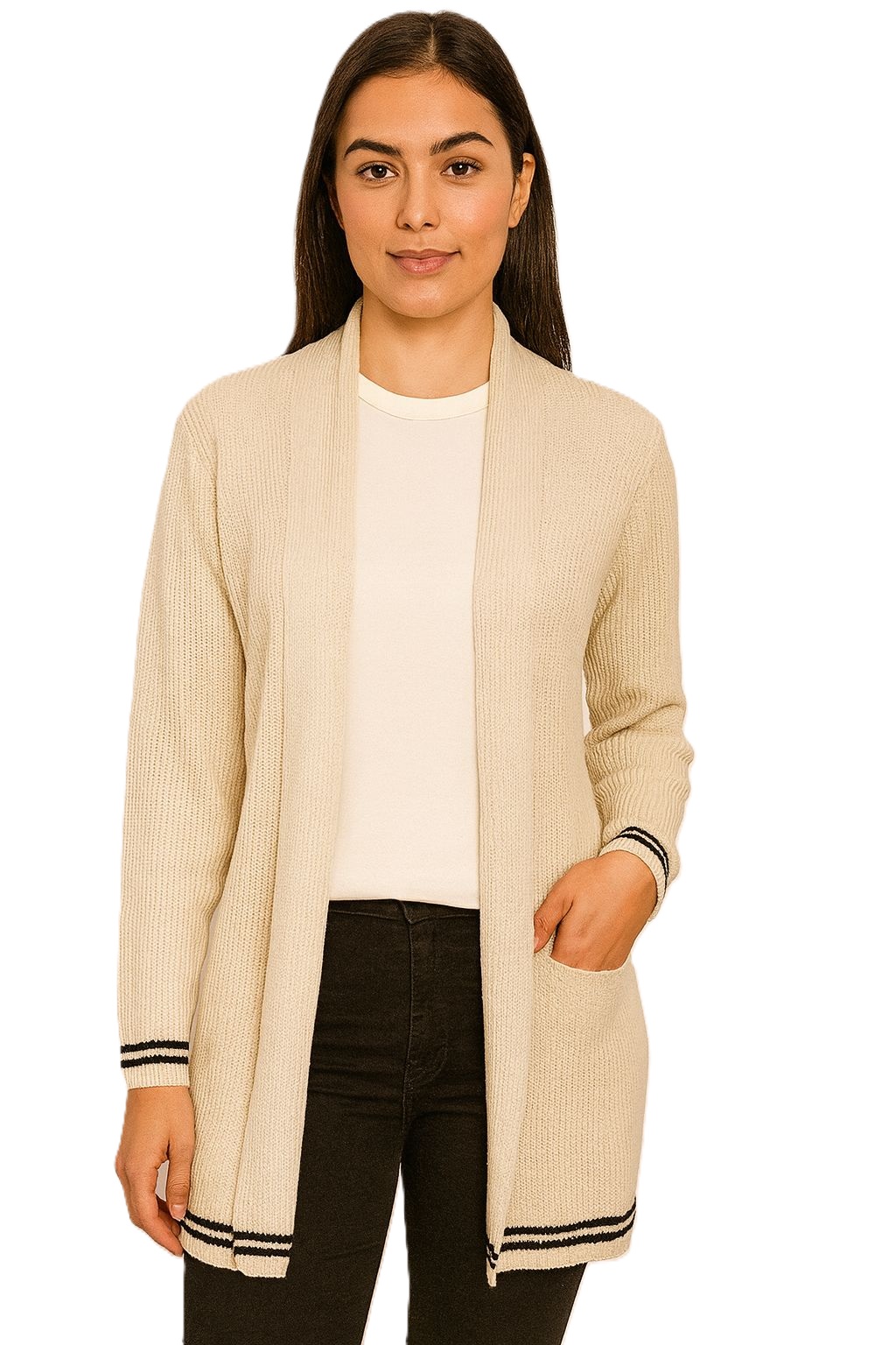 Cardigan Tricot Modal com Listras na Barra, Modelo Solto e Longo, com mangas longas, detalhes com punho canelado, ótimo para arrasar nos dias mais frios.