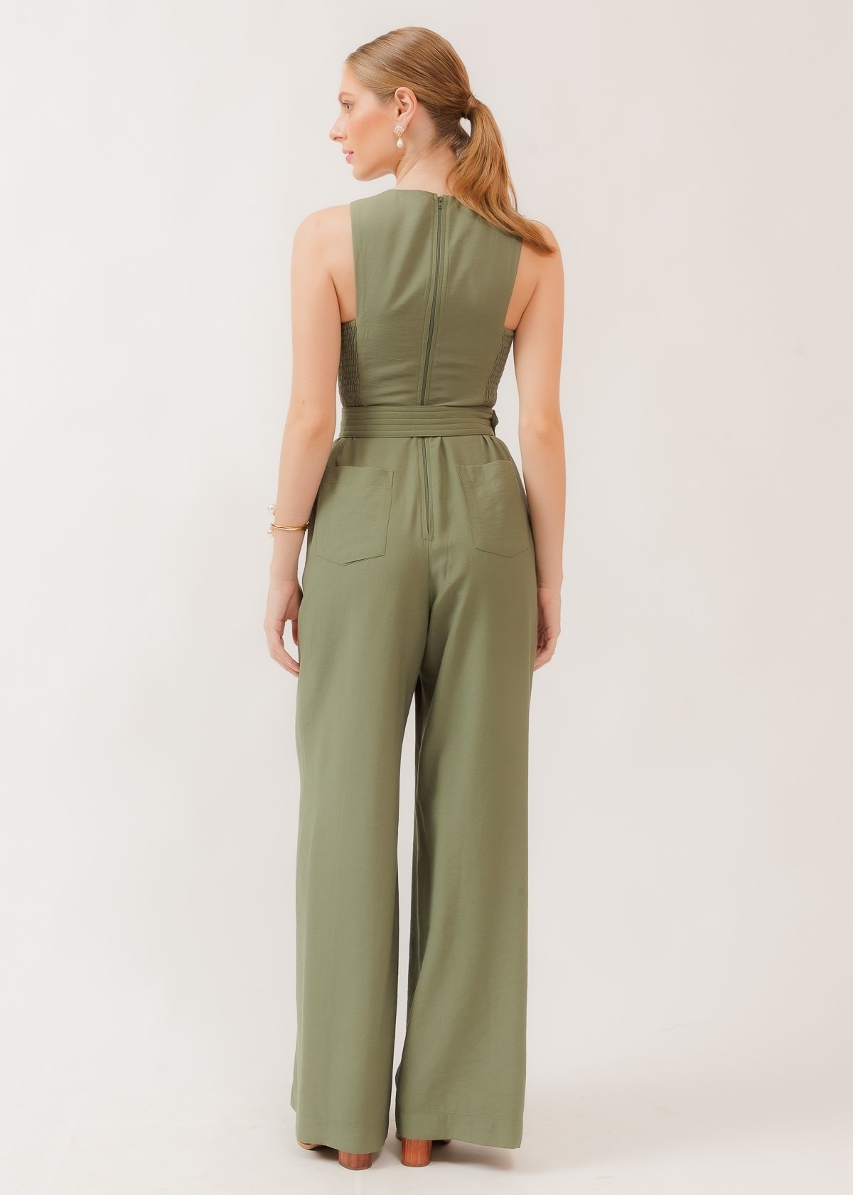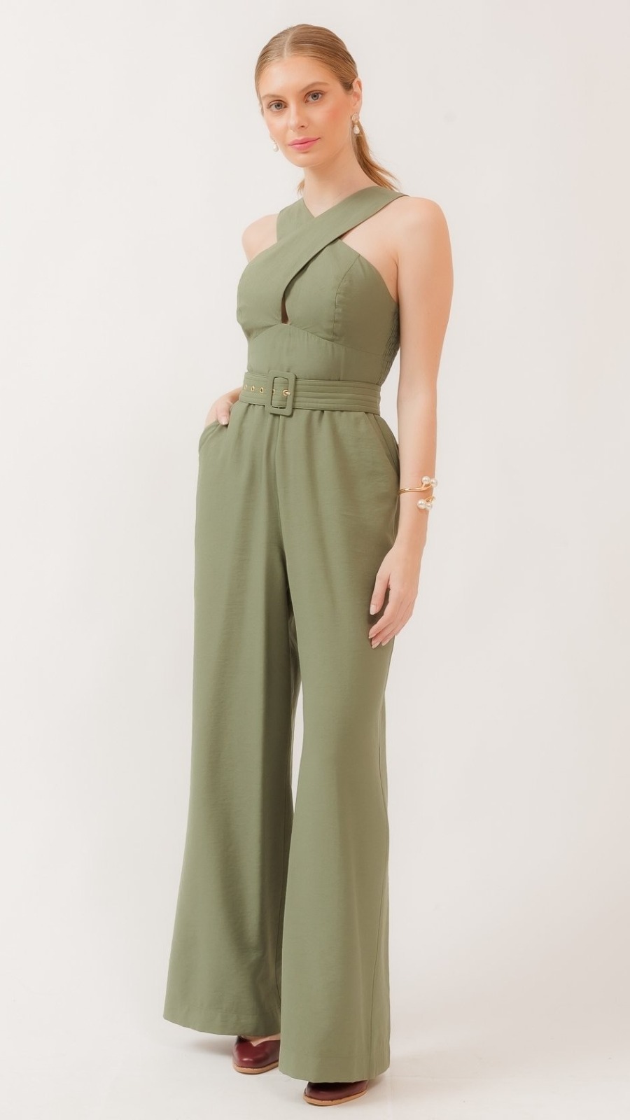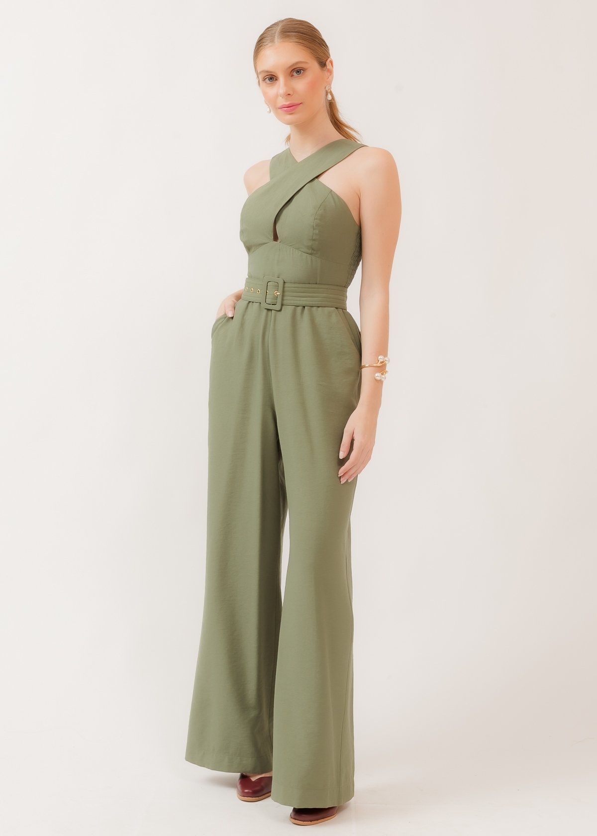 Confeccionado em viscose com alças frontais cruzadas que valoriza o colo. Cintura marcada. Bolsos laterais e traseiros funcionais. A cintura marcada com aplicação de lástex nas laterais, garante ajuste perfeito ao corpo. Acompanha cinto forrado.
