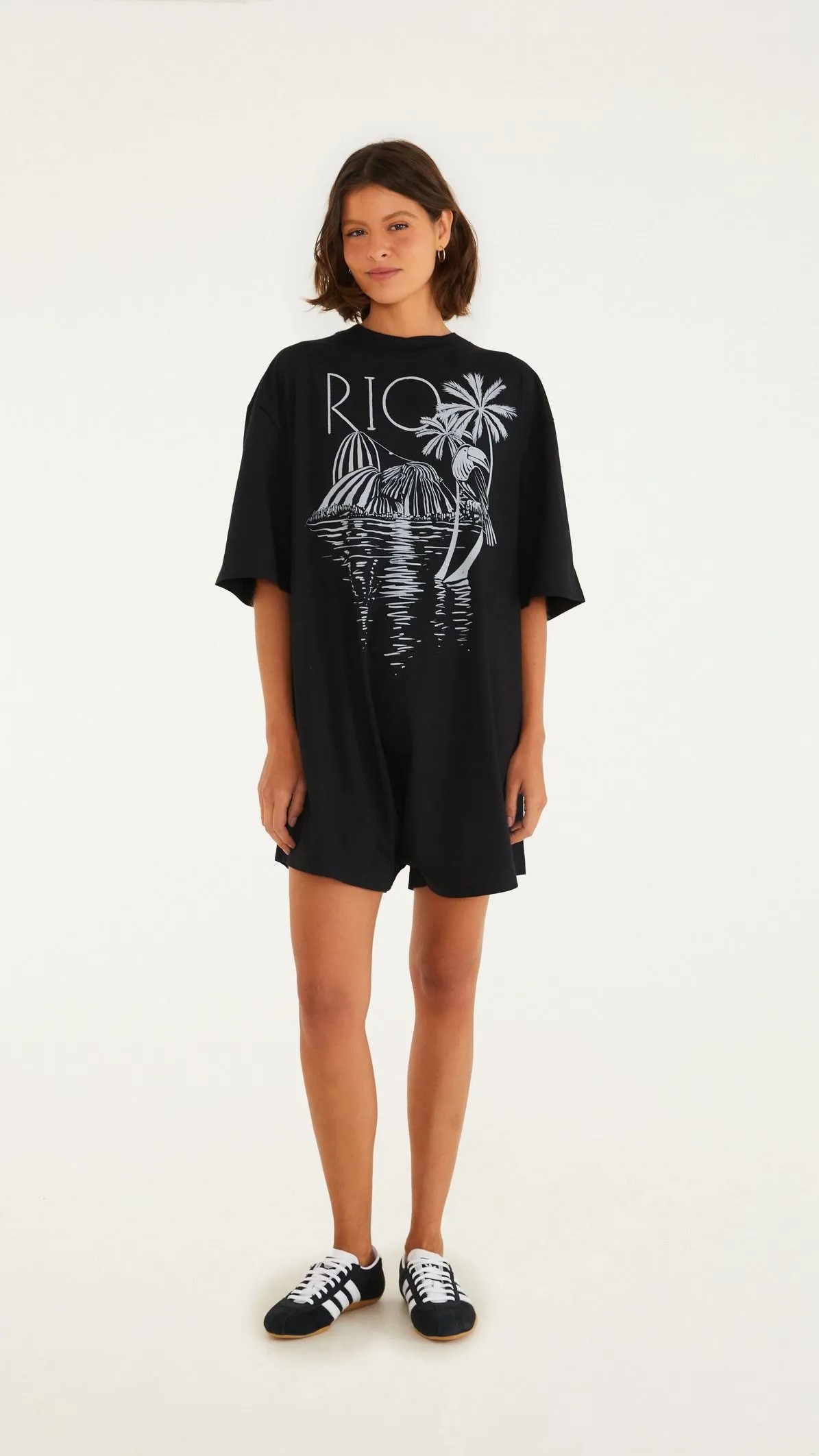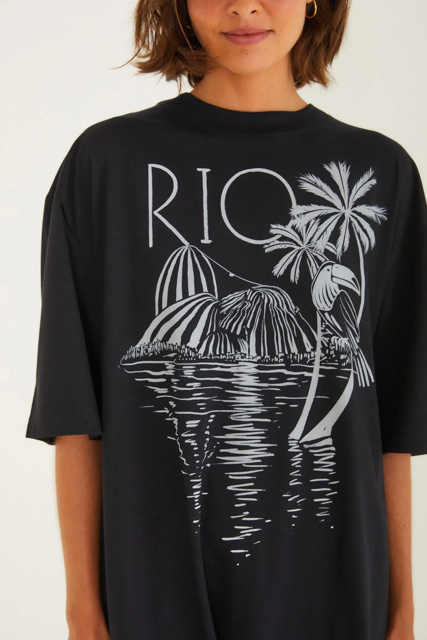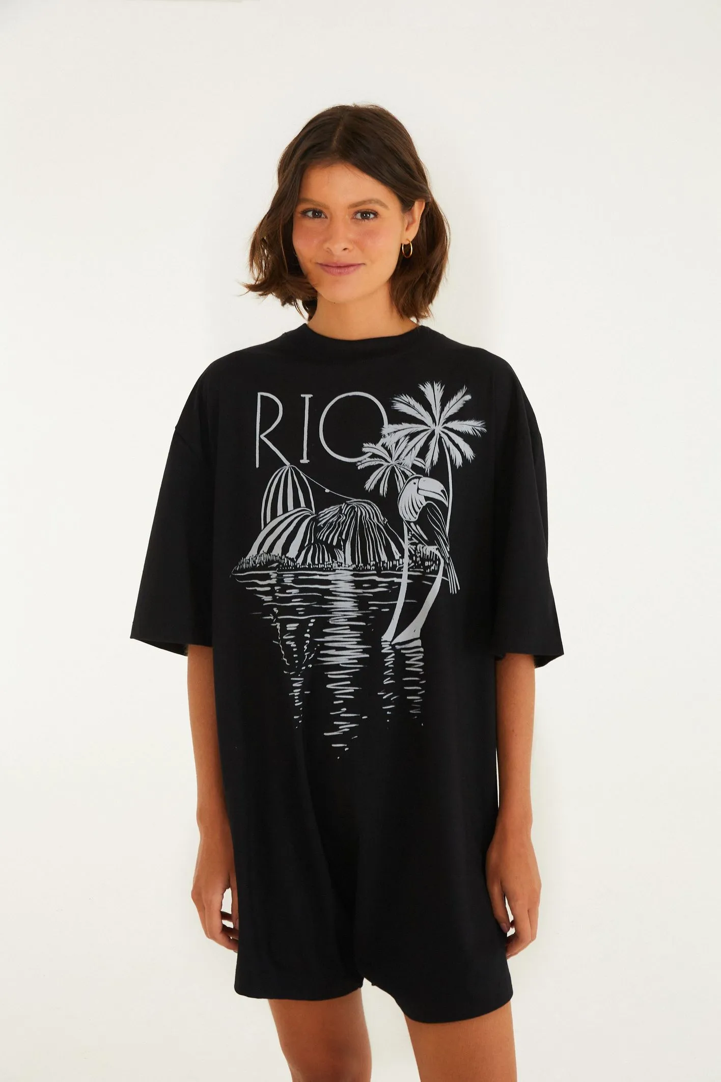 Macaquinho curto rio pb. possui mangas curtas e modelagem solta, proporcionando conforto e frescor. o design casual é perfeito para um passeio ao ar livre ou uma tarde descontraída. aposte nesta peça versátil e cheia de charme para trazer um toque moderno ao seu guarda-roupa. FARM RIO original verão 26.