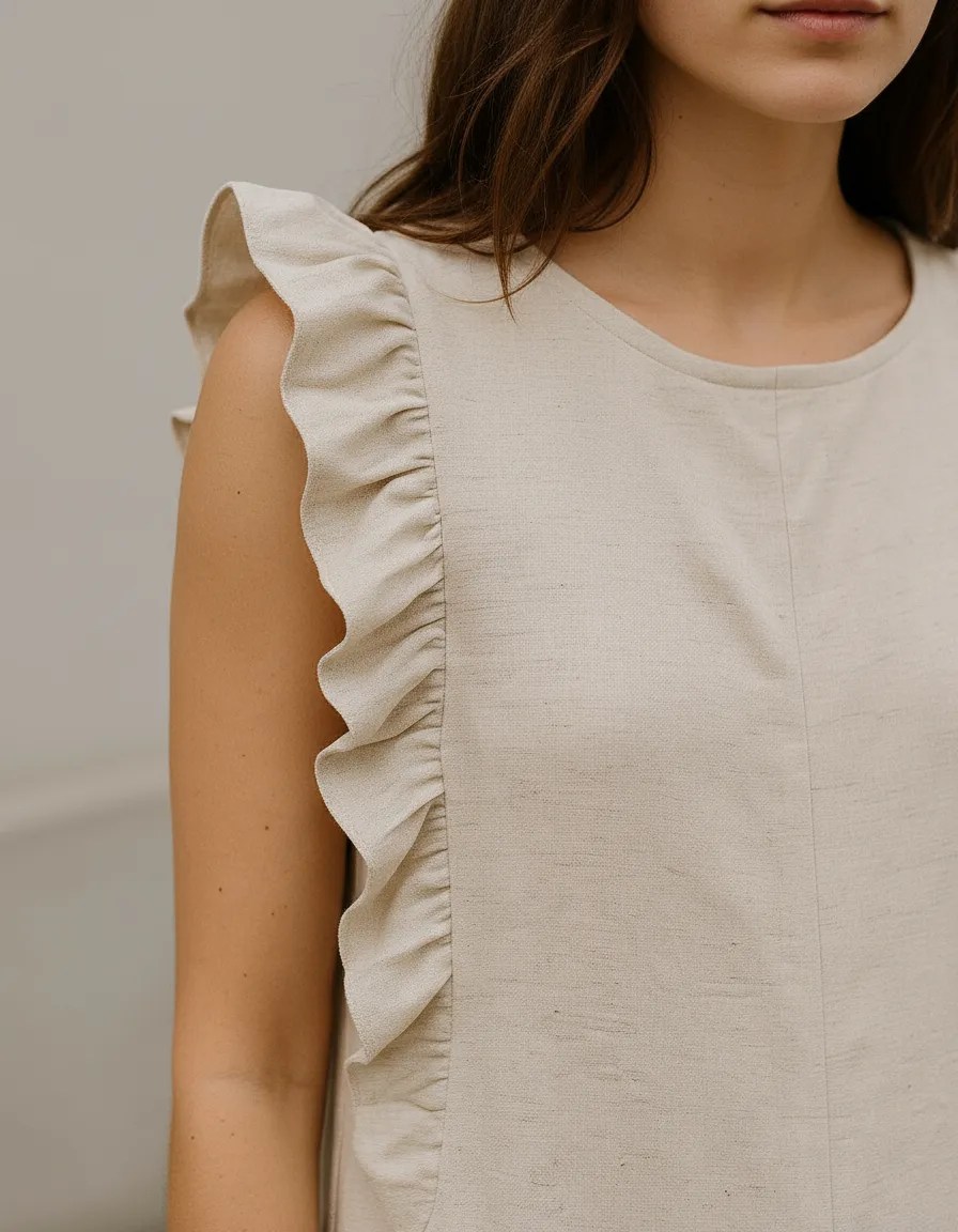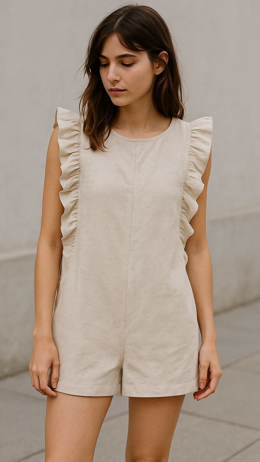 Charmoso e elegante, este macaquinho com mangas de babados lisos é a escolha perfeita para um look sofisticado e moderno. Em uma cor neutra e versátil. As mangas com babados suaves trazem um ar romântico e feminino, ideal para diversas ocasiões, desde um passeio casual até um evento mais formal. Combine com sandálias ou sapatilhas para um visual cheio de estilo e personalidade.