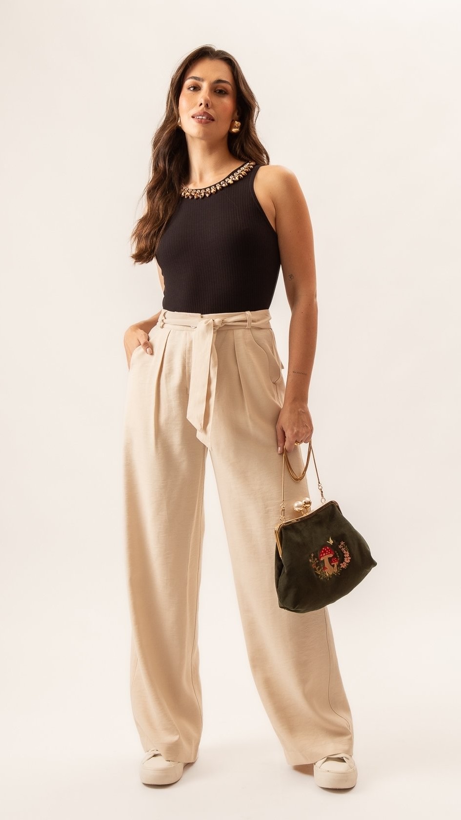 Confeccionada em malha de ribana. Decote redondo com aplicação de pedras acrílicas em formato de gota com estampa animal print e strass cristal, trazendo um toque sofisticado e moderno à peça, uso removível. Mangas cavadas.