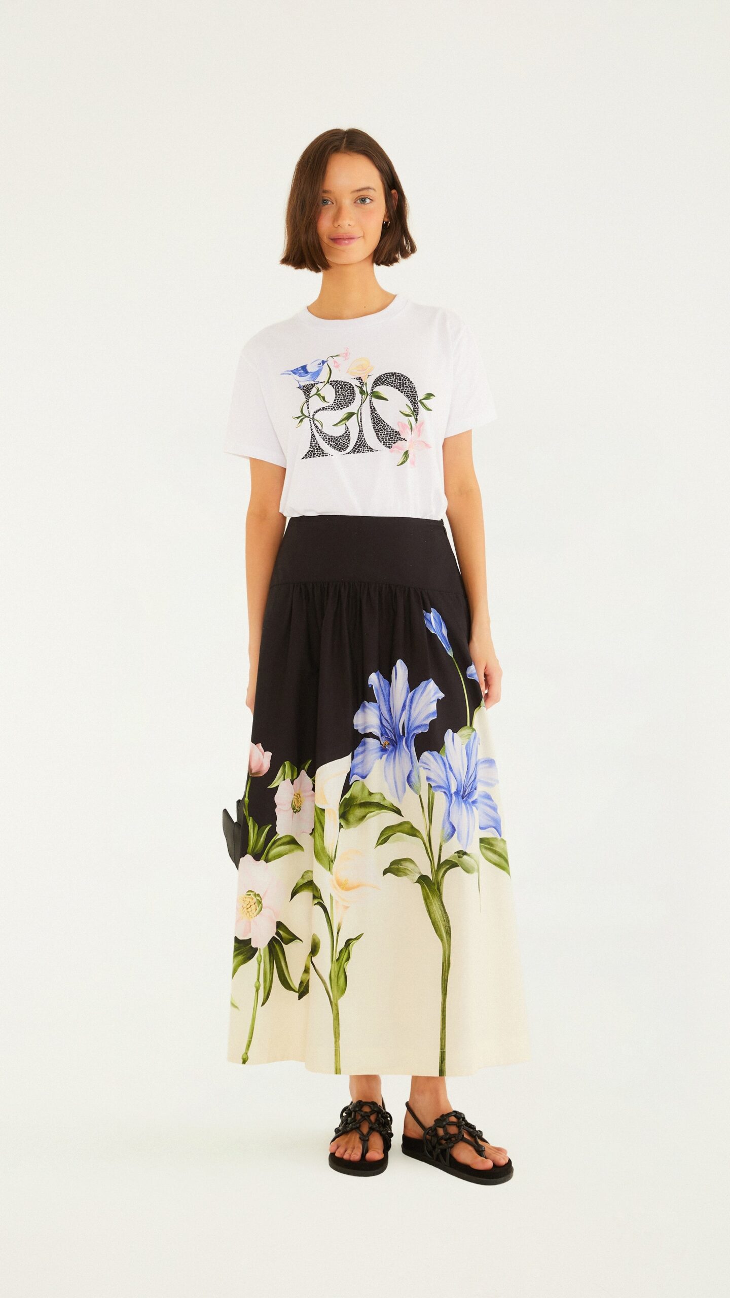 saia ampla céu de flor. com cintura alta e corte evasê, proporciona um movimento fluido e cheio de charme. a peça traz uma barra alegremente estampada, perfeita para dias casuais ou eventos especiais, sempre garantindo um toque de originalidade ao look. ideal para combinar com blusas ou croppeds, criando combinações leves e modernas. FARM Rio, coleção Carioca – inverno 26.