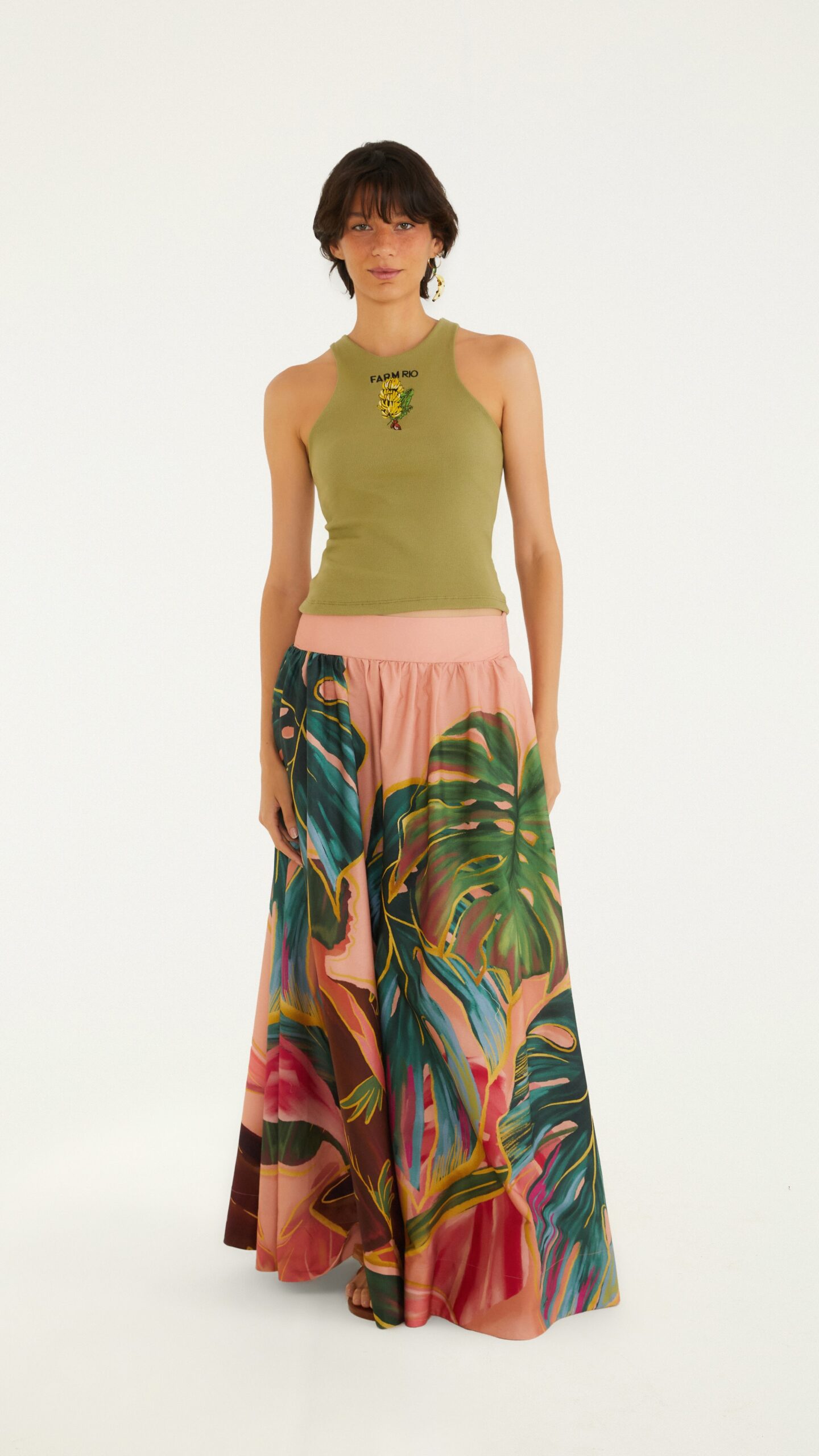 Com estampa vibrante inspirada na natureza tropical, a Saia Evasê Piscina Tropical é aquela peça que traz leveza e estilo ao look. Possui modelagem ampla e cintura alta com pala em tom contrastante, garantindo conforto e um caimento fluido. Perfeita para dias ensolarados e produções cheias de personalidade.