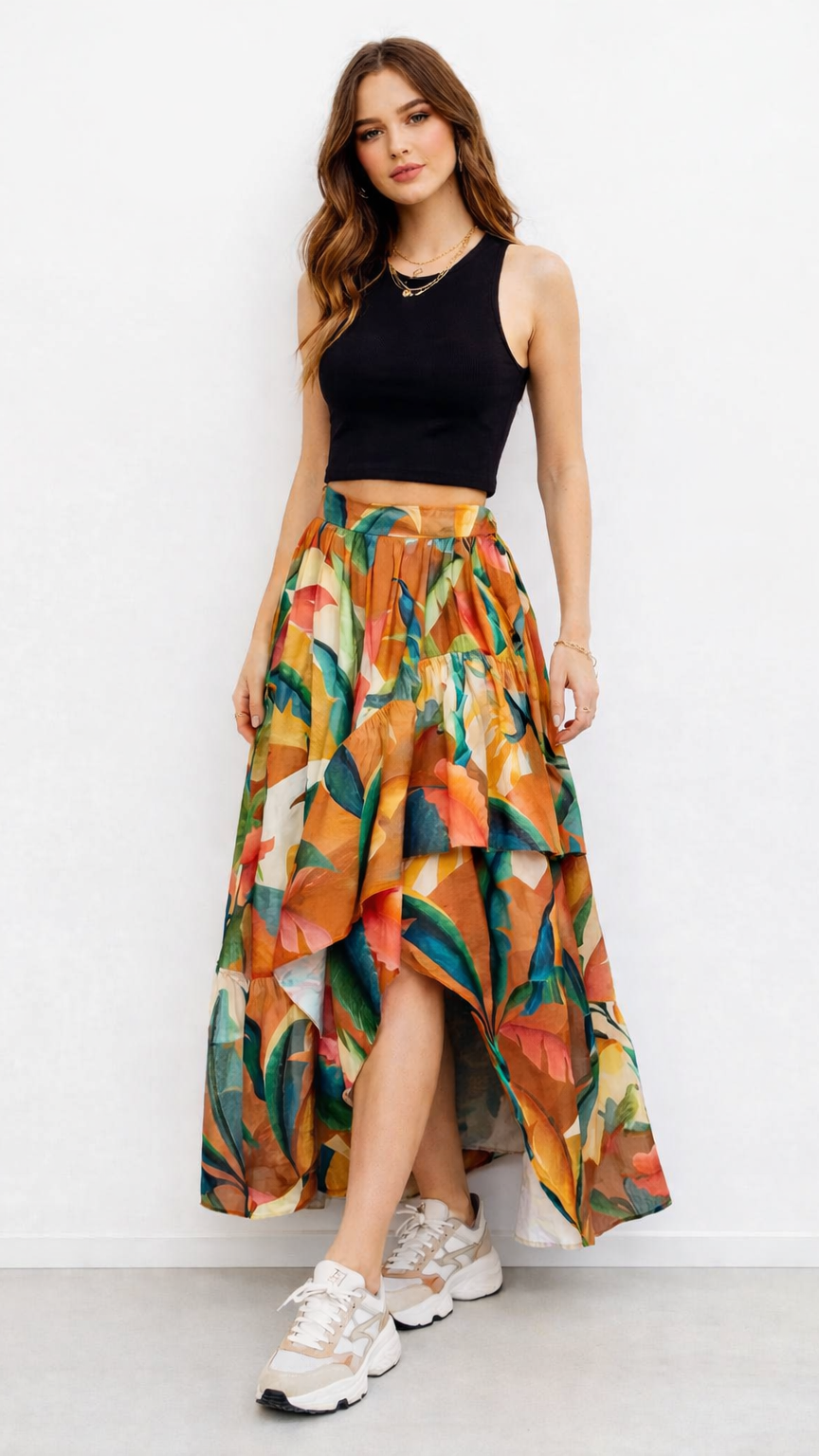 A saia longa mata alta é confeccionada em tecido leve sem elasticidade. A peça solta ao corpo possui cintura alta, elástico embutido na parte posterior do cós, detalhe de babados assimétricos aplicados na parte frontal, recorte frontal, mix de estampas em cores contrastantes e comprimento midi.