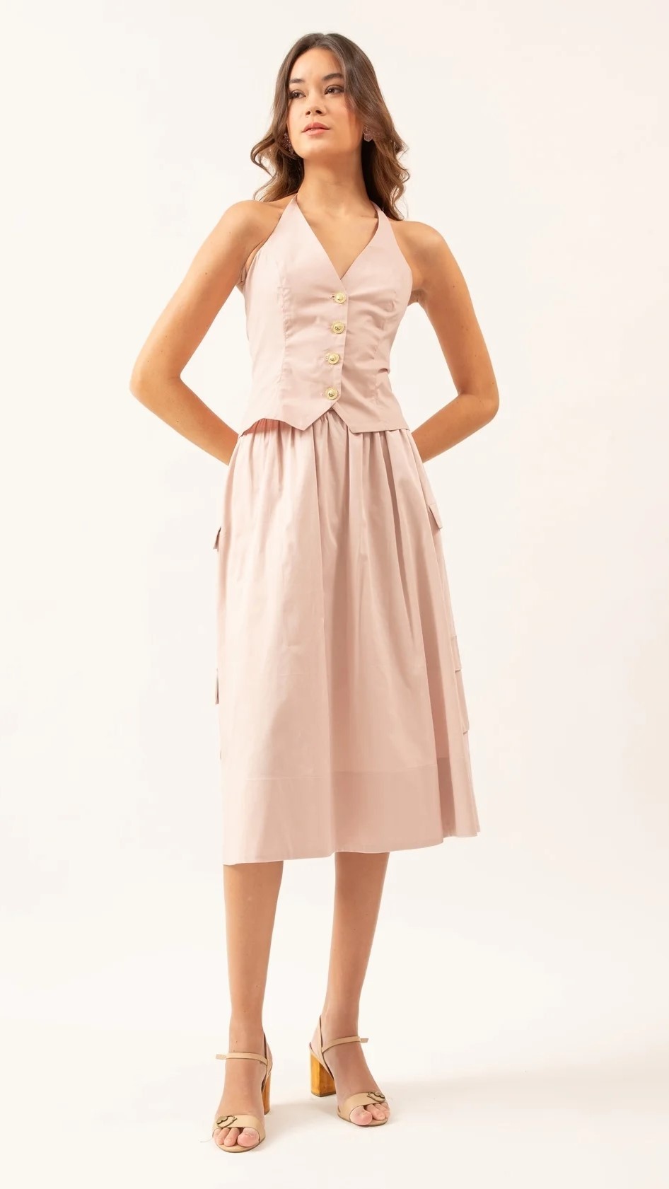 Confeccionada em tricoline acetinada com cós alto e elástico na parte de trás garantindo um ajuste perfeito. O franzido superior adiciona sofisticação e bolsos laterais funcionais, sendo dois deles com botão dourado.