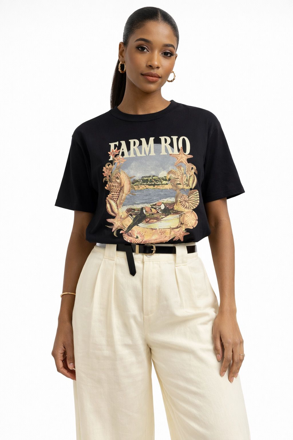 tshirt media moldura conchas da farm traz uma combinação única e original para seu guarda-roupa. com decote redondo e mangas curtas, é ideal para ocasiões casuais e para compor um look despojado e autêntico. o toque moderno da arte estampada acrescenta personalidade a cada momento. FARM Rio, coleção Carioca – inverno 26.