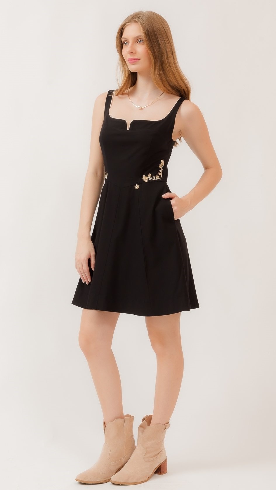Vivos aplicados contornam a peça com precisão, enquanto o exuberante bordado floral nas laterais adiciona um toque de romantismo, equilibrado por uma base clássica. O comprimento curto, os bolsos laterais e o zíper posterior completam a proposta com praticidade.
