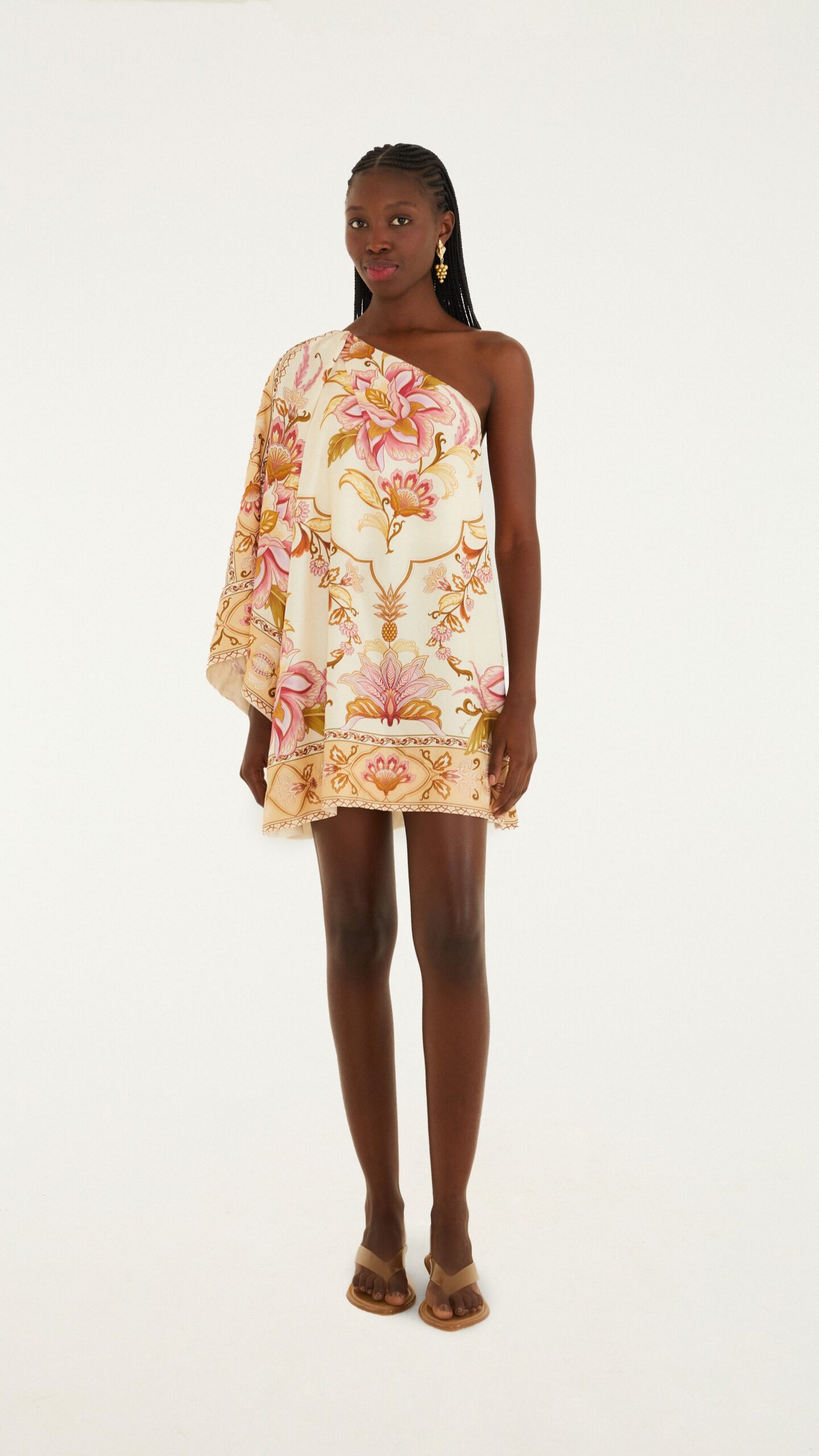Elegante e cheio de personalidade, o Vestido Curto Jardim Majestoso da FARM traz um visual marcante com fundo bege e estampa floral em tons de rosa, lilás e dourado. O modelo de um ombro só com manga longa e larga valoriza o look com sofisticação e um toque moderno. Confeccionado em 100% viscose, oferece leveza e caimento fluido — perfeito para ocasiões especiais ou para quem ama um visual único e cheio de charme!