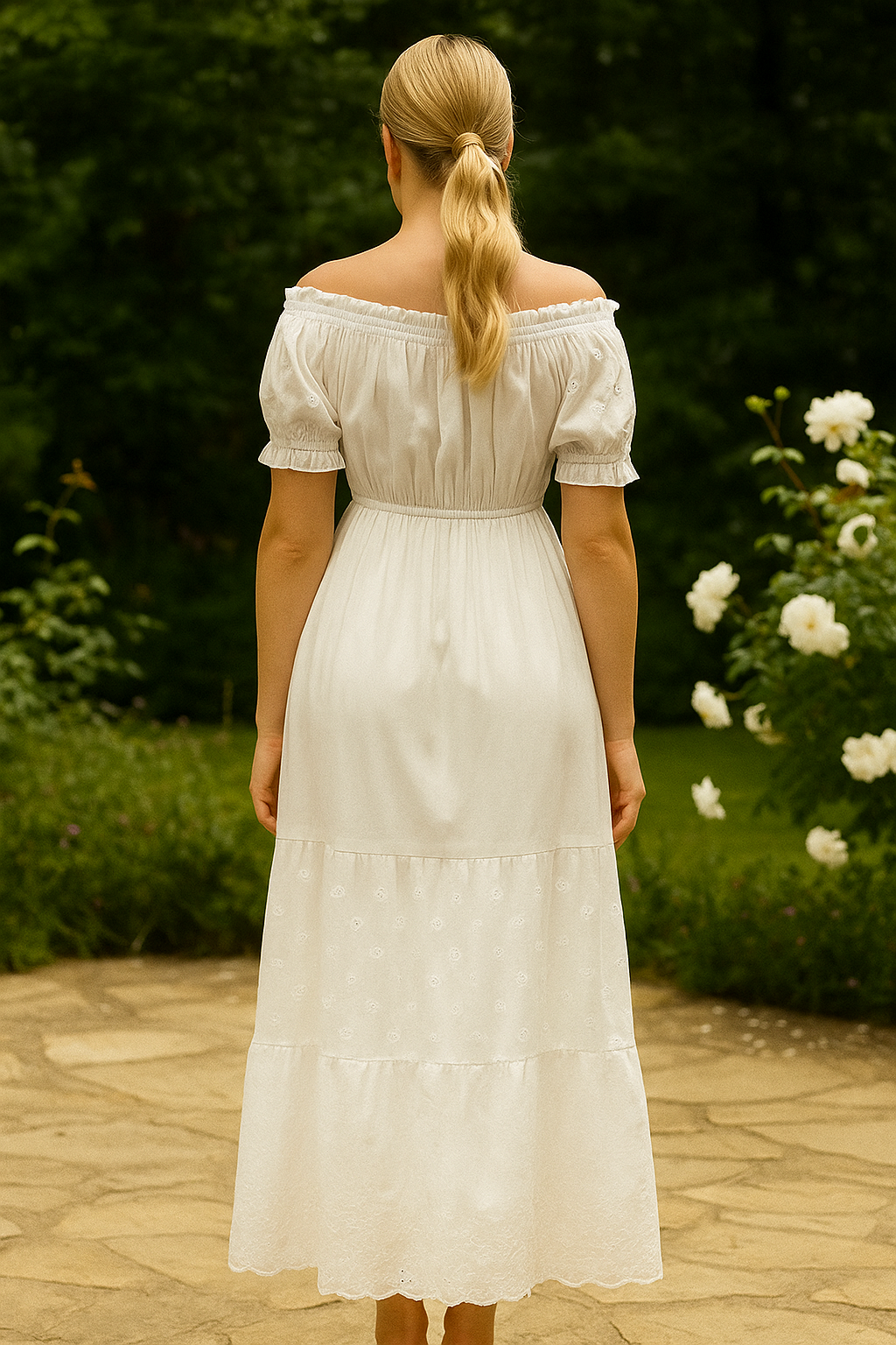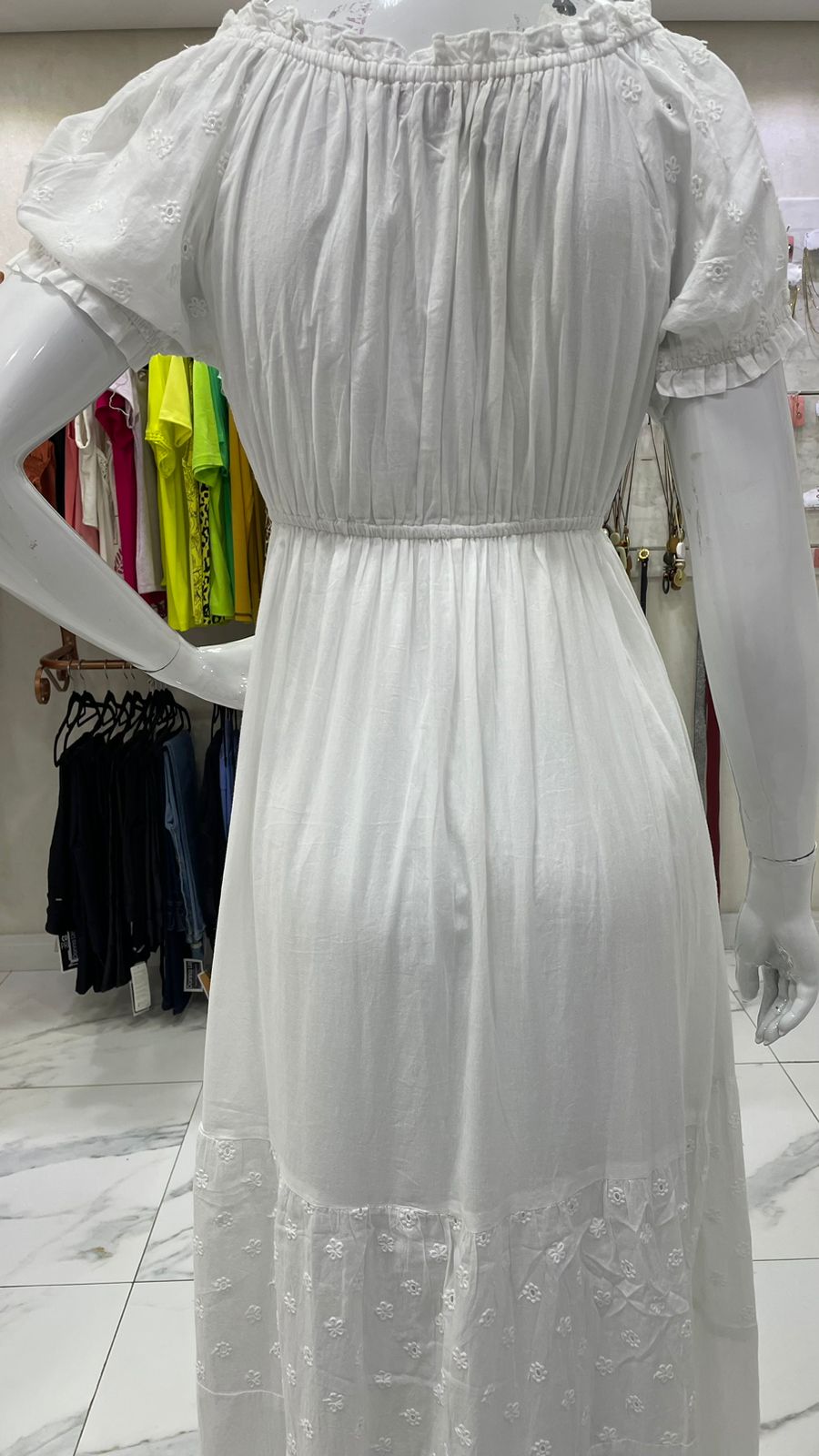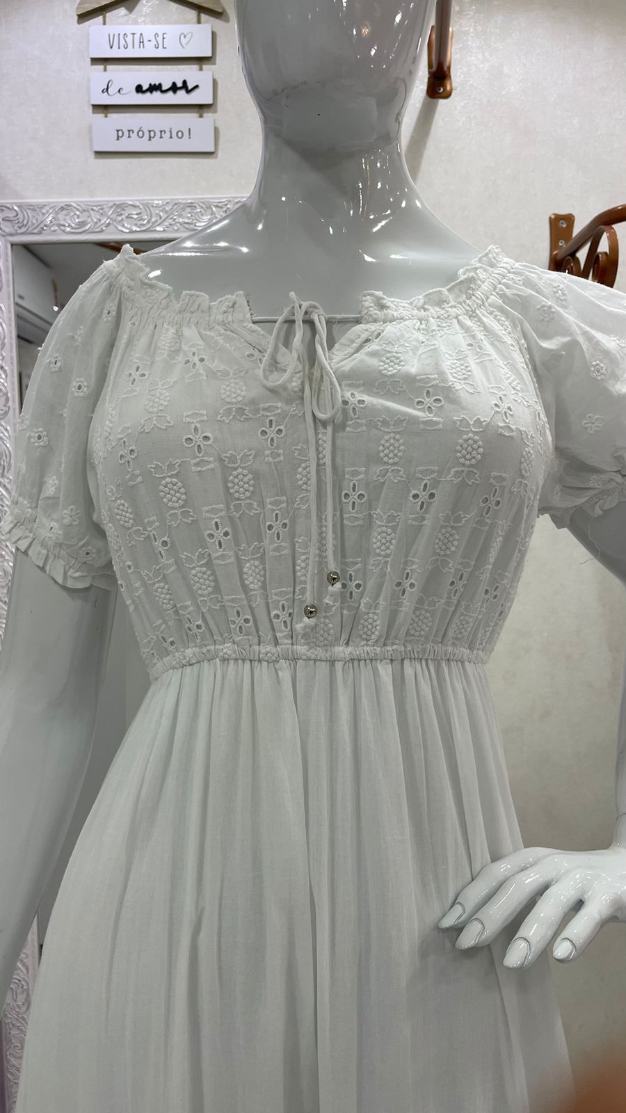 Vestido Longo Bordado com Mangas Branco, cintura marcada com elástico. Possui decote Reto, detalhes de renda por toda saia e forro interno.