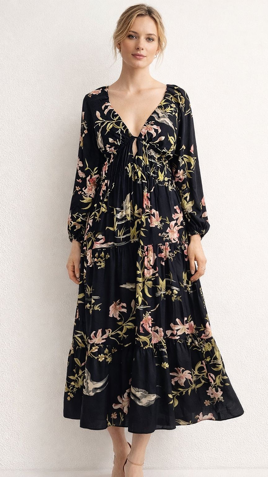 Vestido longo feminino floral com fundo preto, ideal para quem busca elegância, leveza e sofisticação em uma única peça. Com caimento fluido e design atemporal, valoriza a silhueta de forma natural, proporcionando conforto e movimento ao vestir. A estampa floral em tons de rosa e verde traz delicadeza e um toque moderno, perfeito para diversas ocasiões. O modelo possui decote em V que valoriza o colo, mangas 3/4 levemente bufantes e modelagem com cintura império, que alonga a silhueta e garante um ajuste confortável. A saia em camadas proporciona leveza e um movimento elegante ao caminhar, tornando a peça ainda mais feminina.