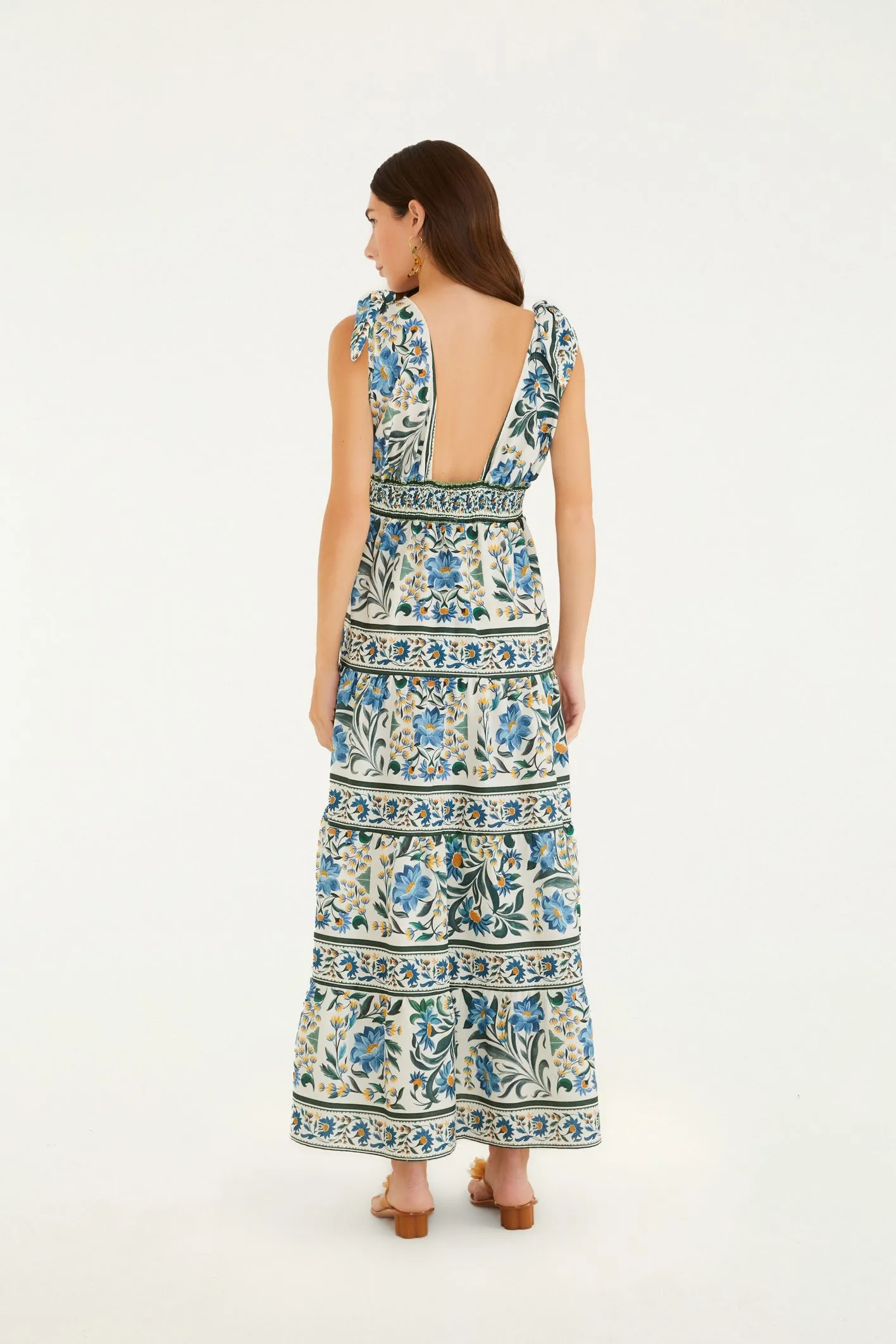 Vestido marias estampado manoela. possui decote em v profundo que se destaca e alças largas que conferem conforto. a peça traz um corte fluido e leve, ideal para um look casual em dias ensolarados. o caimento destaca o estilo descontraído, perfeito para passeios ao ar livre ou encontros. FARM RIO original – verão 26.