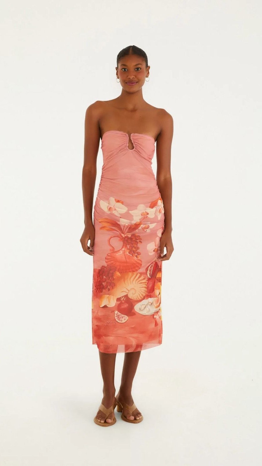 O Vestido Midi Afrodite da FARM Rio é uma peça elegante e romântica, perfeita para ocasiões especiais ou momentos casuais com estilo. Apresenta modelagem tomara que caia, realçando os ombros e o colo de forma delicada. Sua estampa floral exclusiva, com romãs, orquídeas e jarros, traz um toque artístico e feminino.