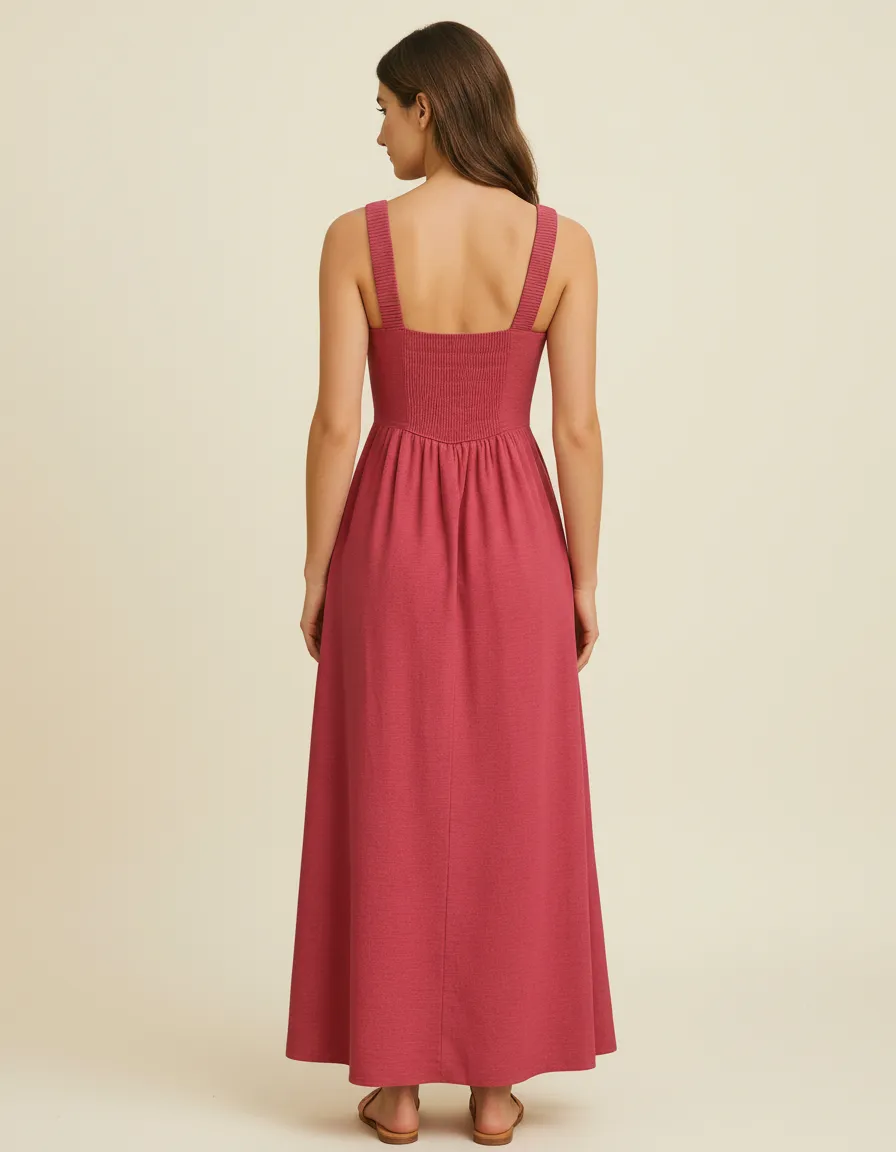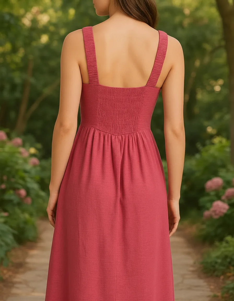 Confeccionado em tecido 42% algodão 38% viscose 14% modal e 6% linho, o vestido midi liso é romântico e charmoso. Com decote em V justo no busto, a peça possui alças médias com detalhe enrugado e pala que valoriza a silhueta. Os bolsos laterais deixam o vestido moderno ao mesmo tempo que adicionam praticidade.