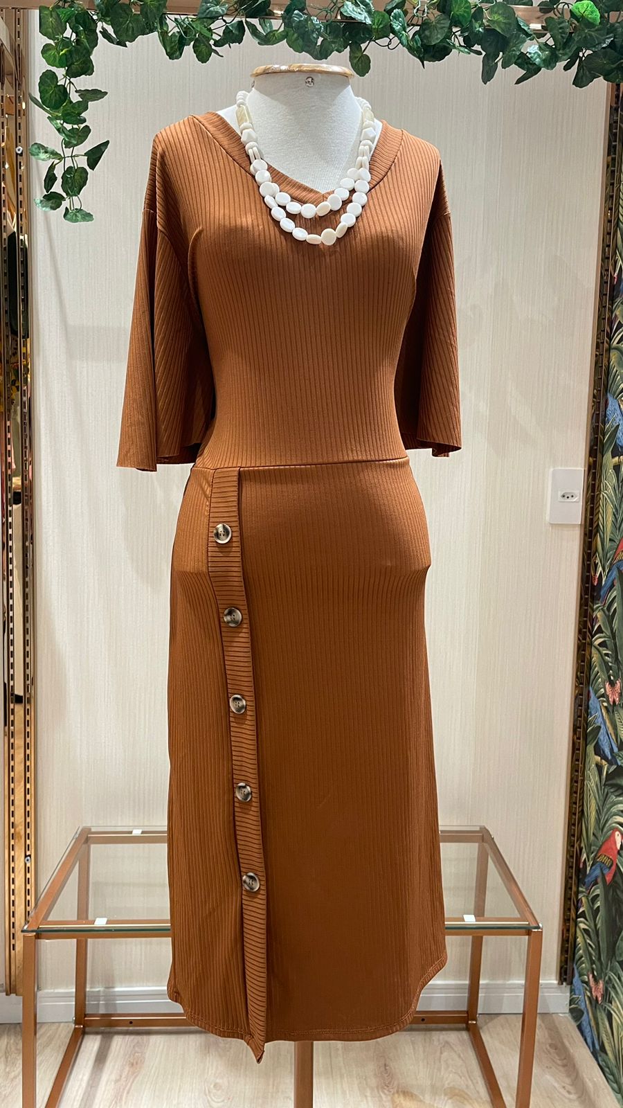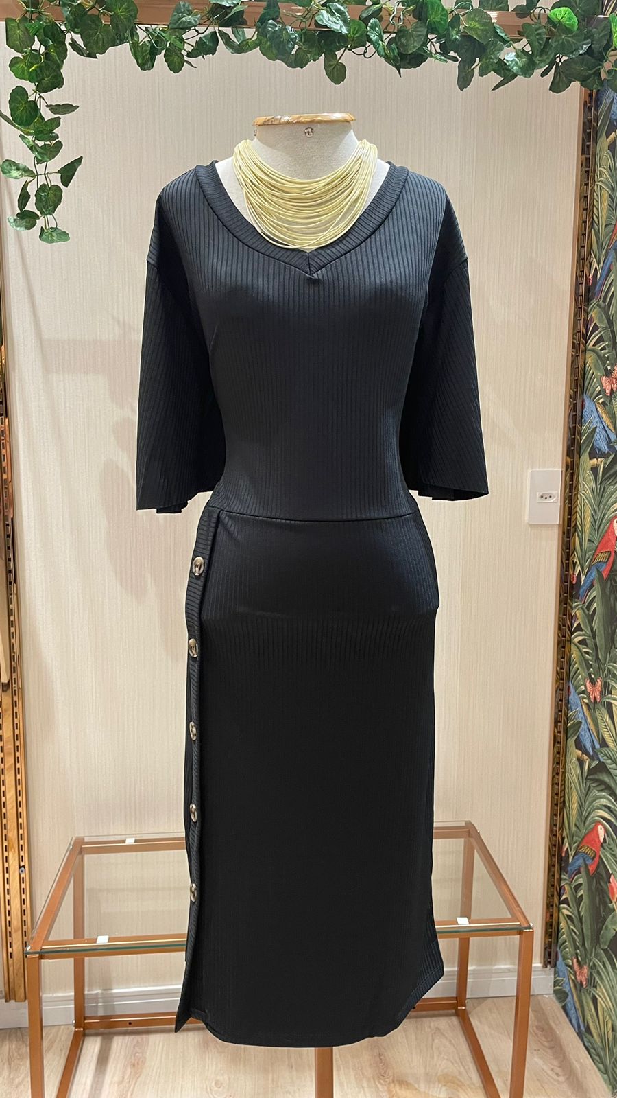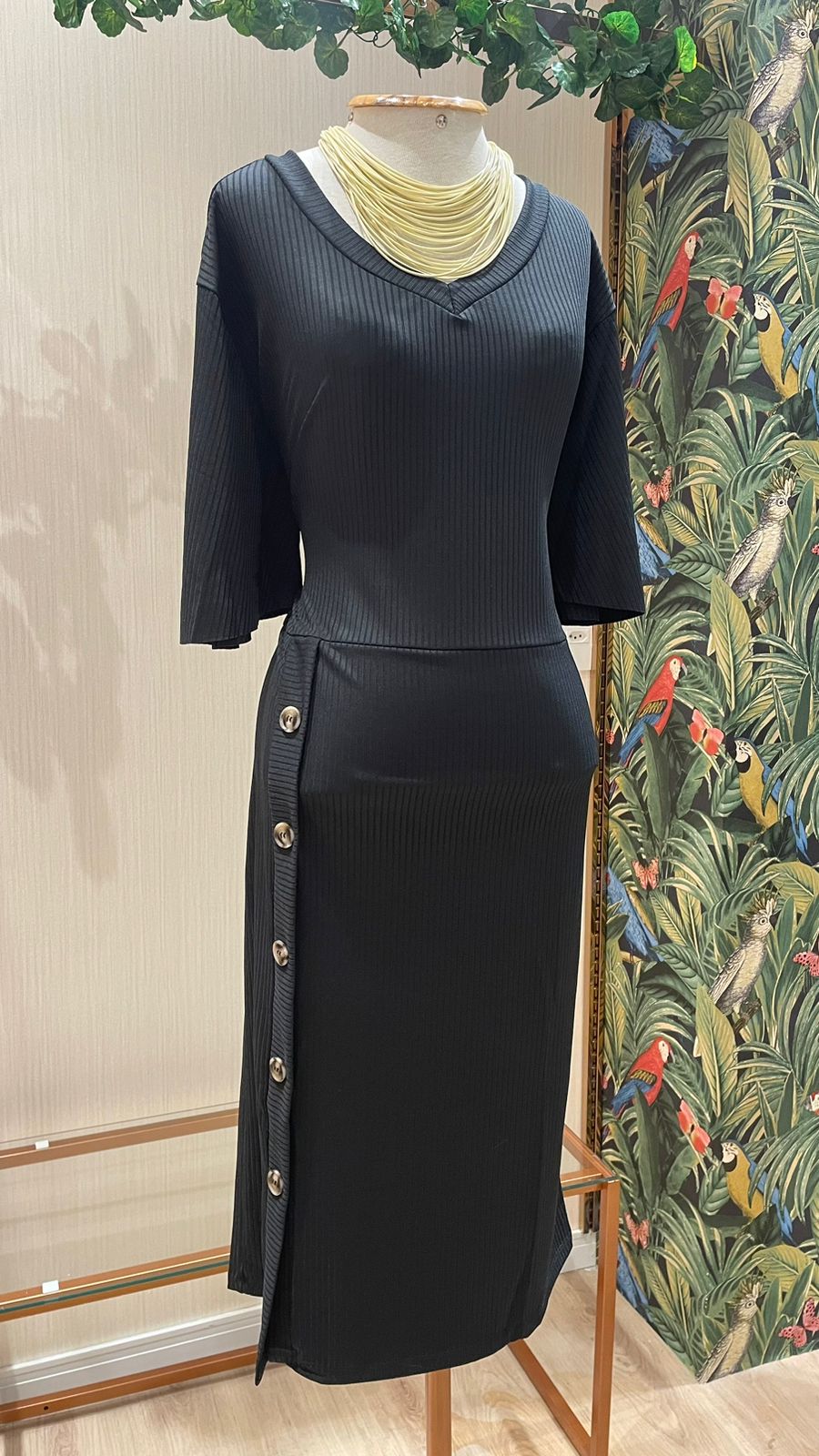 Vestido confeccionado em malha canelada. Possui comprimento midi e caimento solto. Seu decote é em V e suas mangas Curta tipo borboleta, a saia tem detalhe com fenda e botões decorativos, sua barra é pespontada.