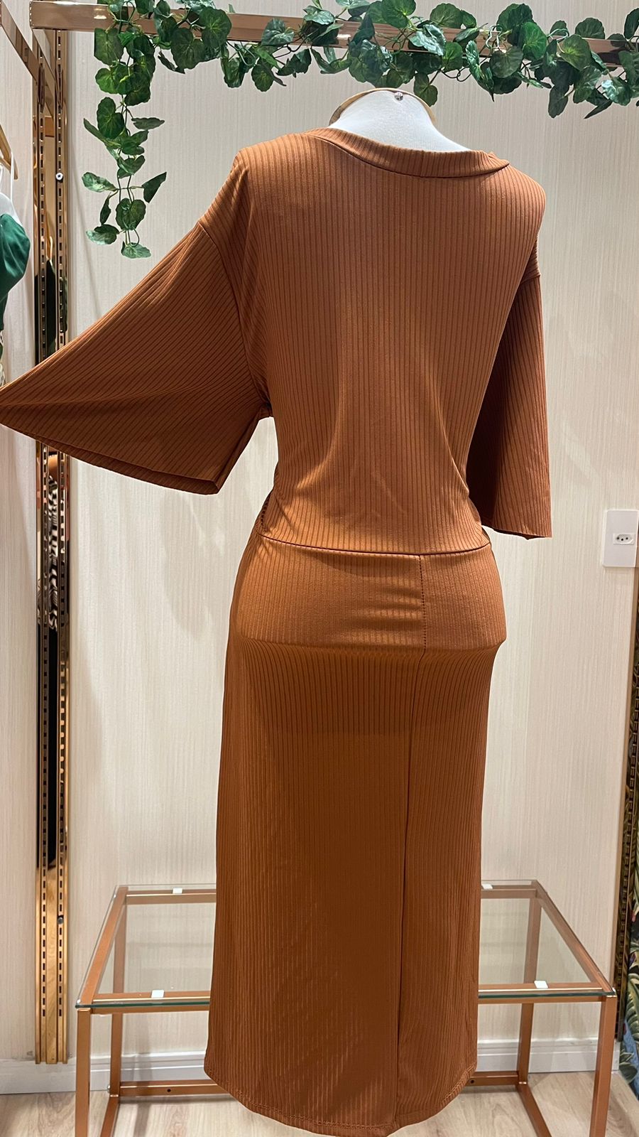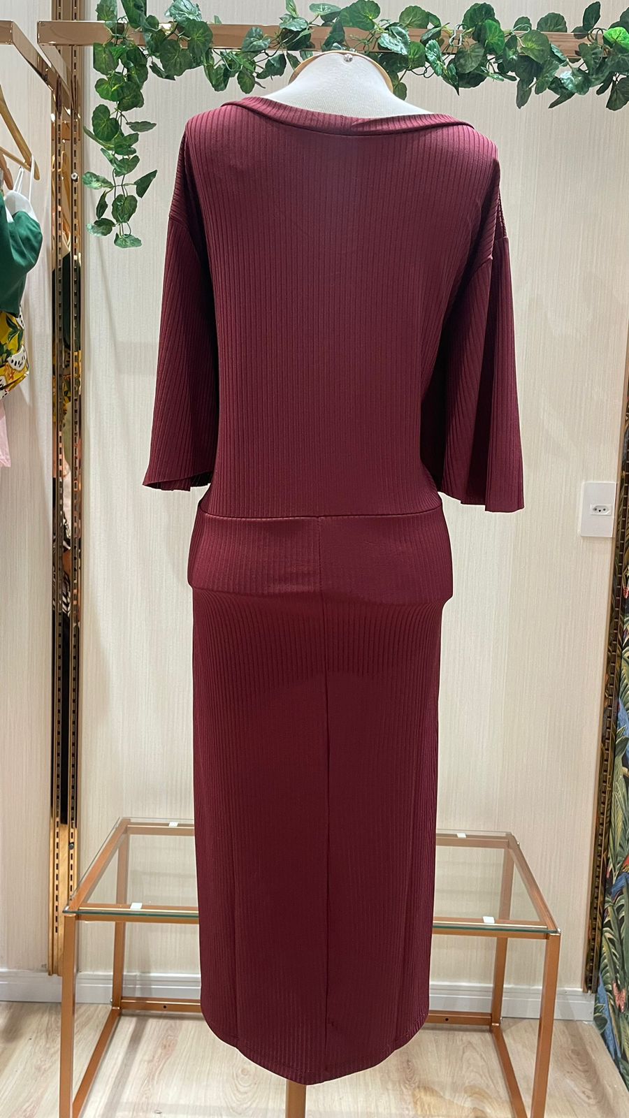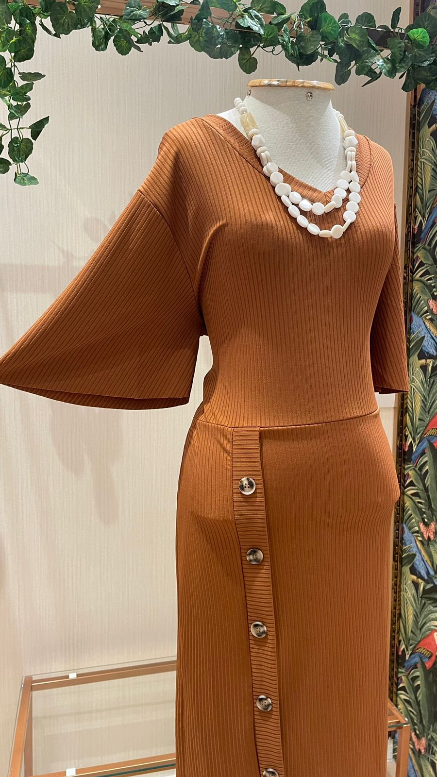 Vestido confeccionado em malha canelada. Possui comprimento midi e caimento solto. Seu decote é em V e suas mangas Curta tipo borboleta, a saia tem detalhe com fenda e botões decorativos, sua barra é pespontada.