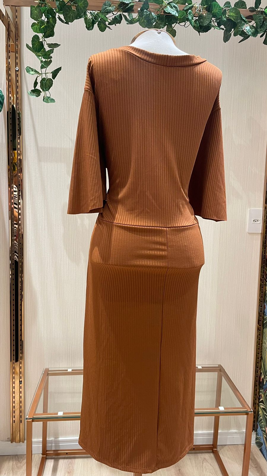 Vestido Midi Canelado com Manga e Fenda com Detalhes