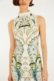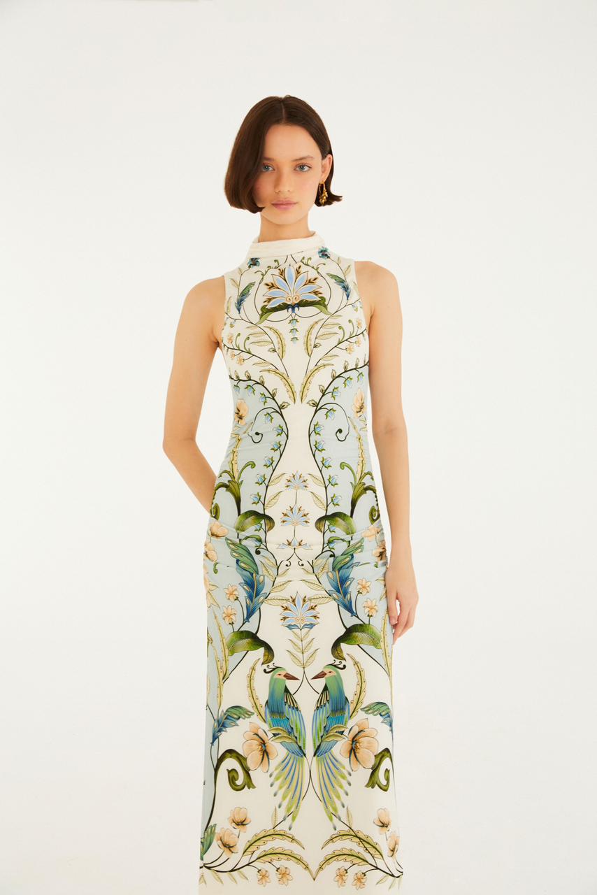 vestido midi estampado milena. com gola alta e corte sem mangas, é a escolha perfeita para eventos casuais ou uma tarde especial. confeccionado em tecido leve, proporciona conforto e frescor. a estampa única eleva a originalidade da peça, trazendo um toque inconfundível à sua coleção.
