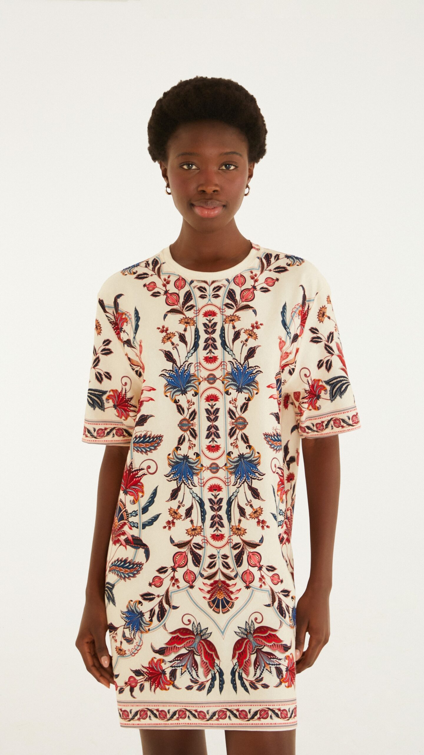 O Vestido T-Shirt Básico Bohoflor da Farm Rio apresenta modelagem confortável, com gola redonda e mangas curtas. A estampa Bohoflor adiciona identidade à peça, tornando-a adequada para uso casual no dia a dia. Produto original Farm Rio, referência 356965.