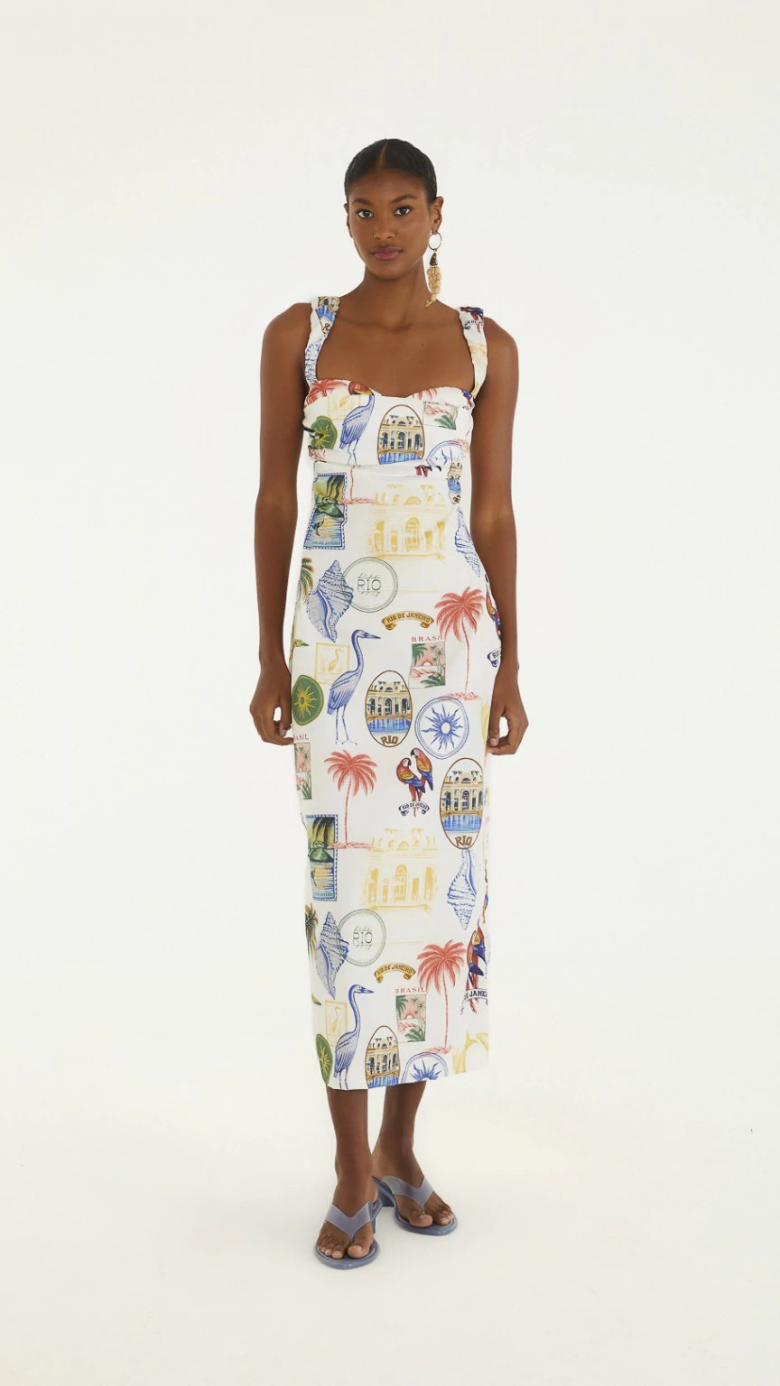 A estampa exclusiva FARM é uma verdadeira viagem cultural, com ícones tropicais e elementos vintage que remetem ao Brasil e ao Rio, cheios de cores e alegria. Uma peça versátil que transita do dia para a noite com muito estilo.